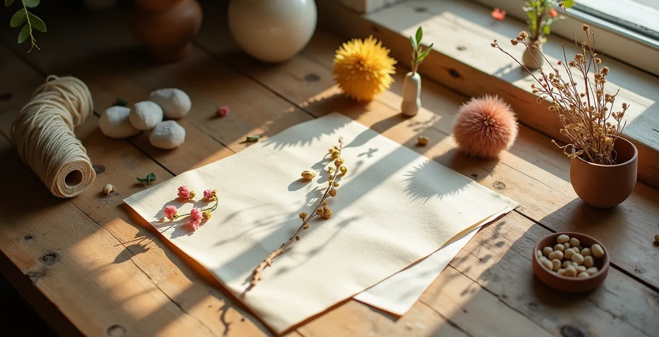 L’idée est « d’anoblir » sa création. Un simple bout de bois trouvé dans la nature, une fois poncé et huilé, acquiert une noblesse incroyable. Une feuille de papier standard devient un trésor si on la remplace par un papier de soie japonais ou un papier à grain épais. Le secret est de privilégier les matières naturelles et nobles au toucher : le bois, le cuir végétal, la laine, le lin, le laiton, le papier de qualité. Ces matériaux apportent immédiatement une impression de qualité et de durabilité que le plastique brillant ou le papier crépon ne pourront jamais égaler.